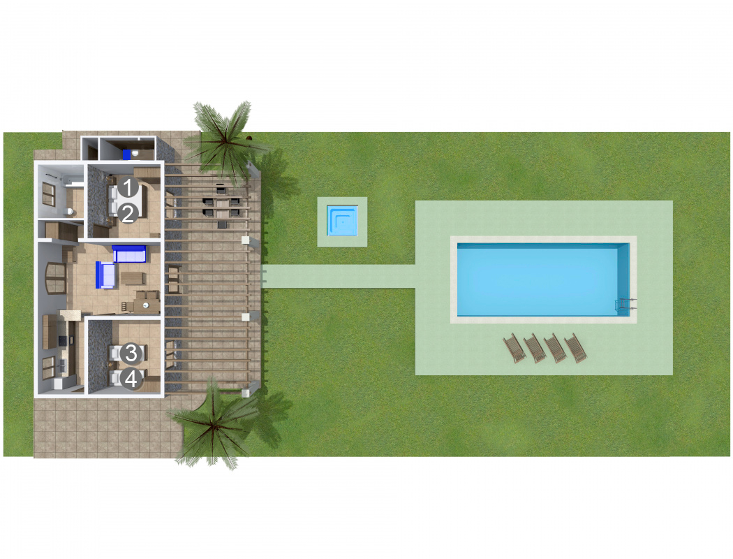 Klimaanlage, Sat-TV, Internet, 2 Safes, elektrischer Ventilator, Waschmaschine, Holzkohlegrill, überdachte Terrasse und vieles mehr.